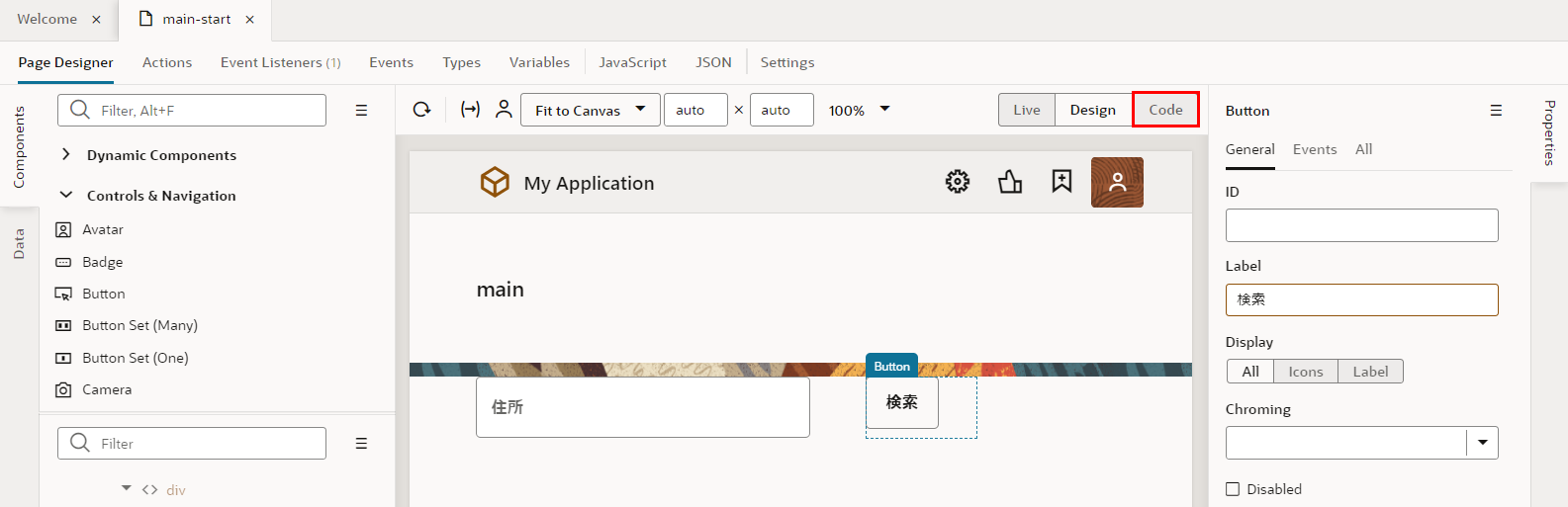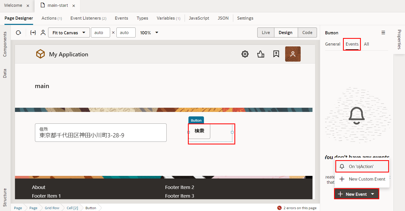 「検索」ボタンを選択します。プロパティ・インスペクタで、「Events」タブ・ページを開きます。「+ New Event」ボタンをクリックすると表示されるメニューから「On ‘ojAction’」を選択します。