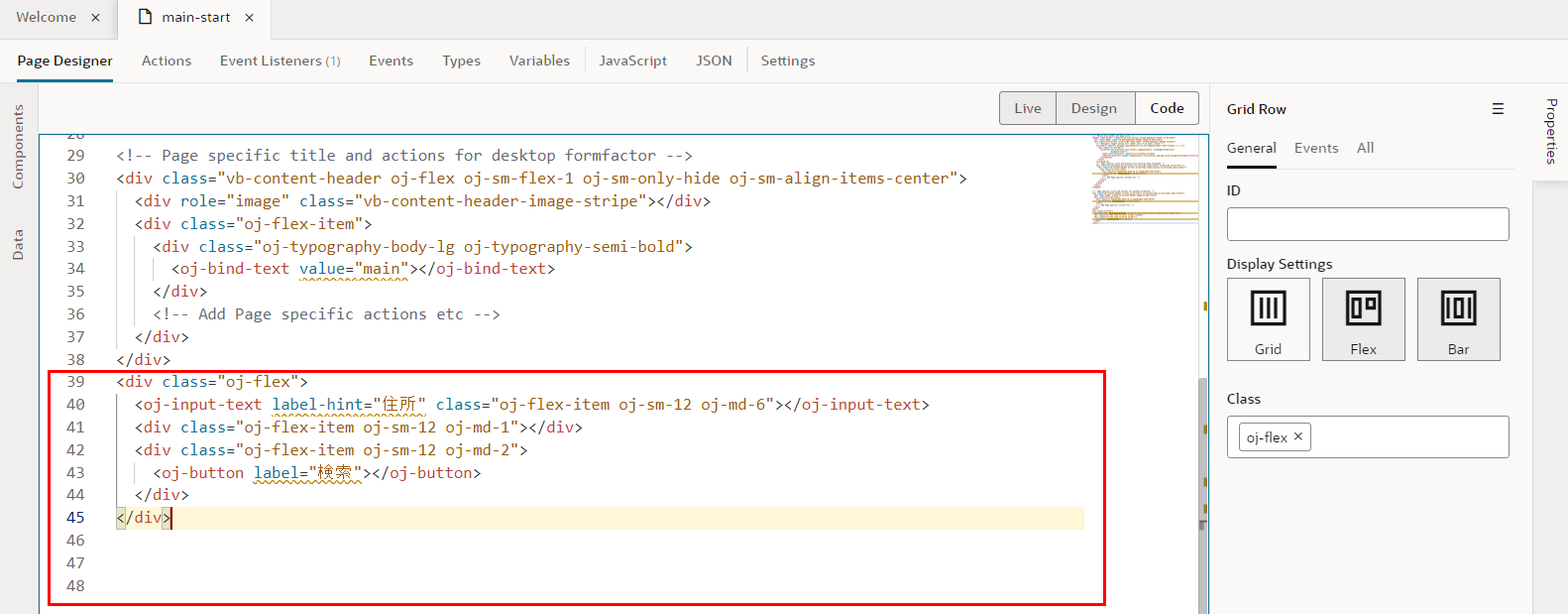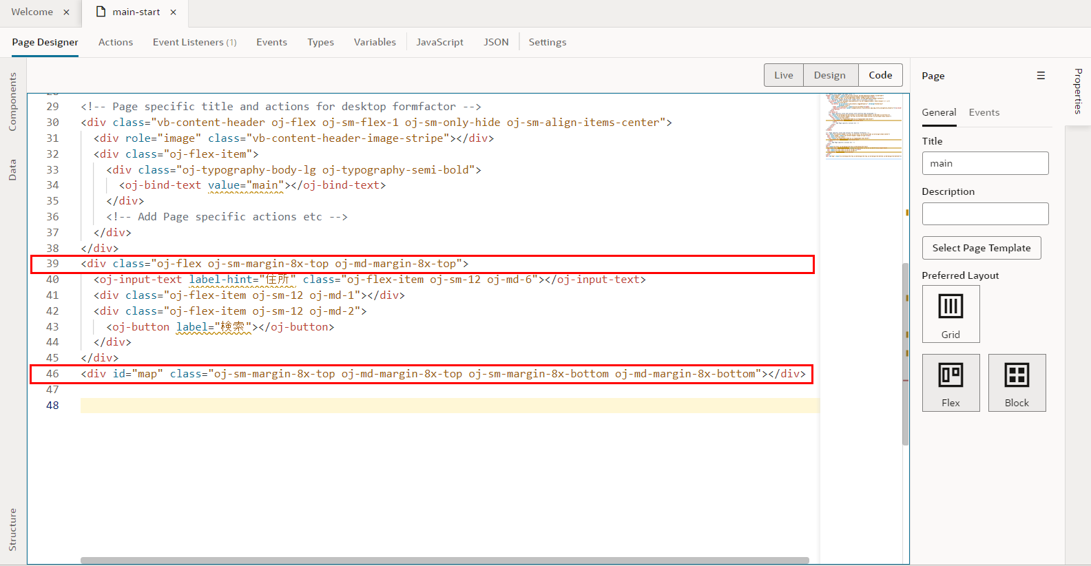 39行目にCSSクラスを追加し、46行目に地図用HTMLコードを追加します。 marginはCSSのプロパティで、要素の全四辺のマージン領域を設定します。追加したCSSクラスは、Oracle JETによって定義されたCSSクラスです。oj-md-margin-8x-topは、画面が中サイズ(md)の場合、要素の上側(top)に8単位(8x)のマージン領域を設定することを意味します。詳細はこちらをご確認ください。