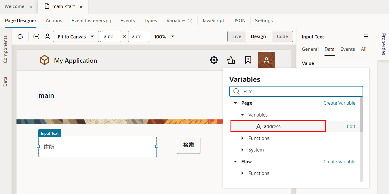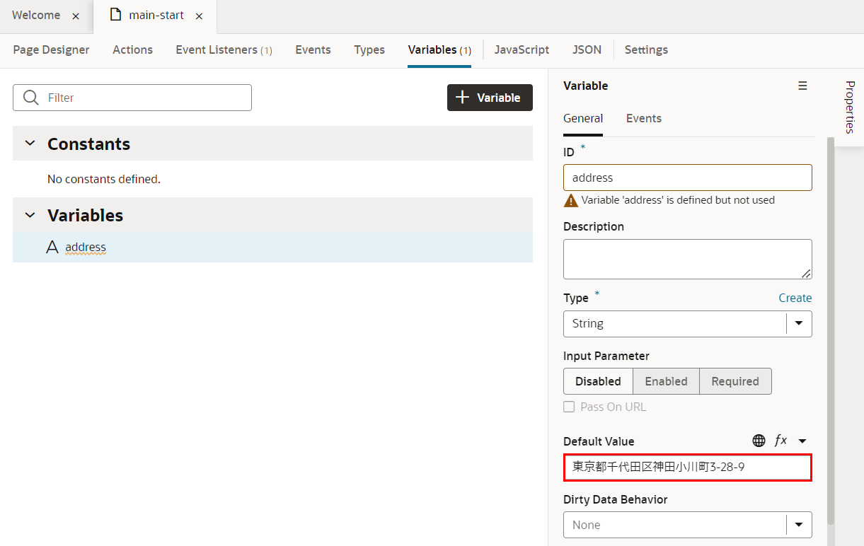 変数「address」のプロパティ・インスペクタで「Default Value」フィールドに「東京都千代田区神田小川町3-28-9」と入力します。