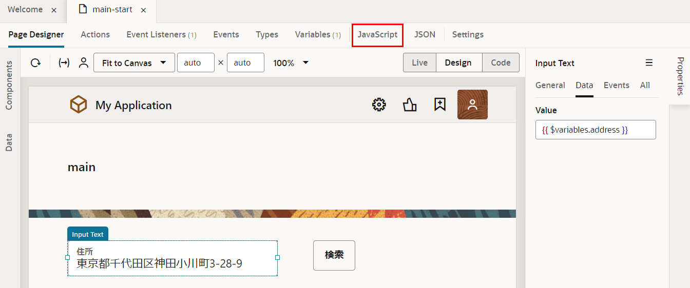 このパートでは、main-startページを編集して、テキストボックスに入力された住所の値を基に地図上にピンマークを設置します。