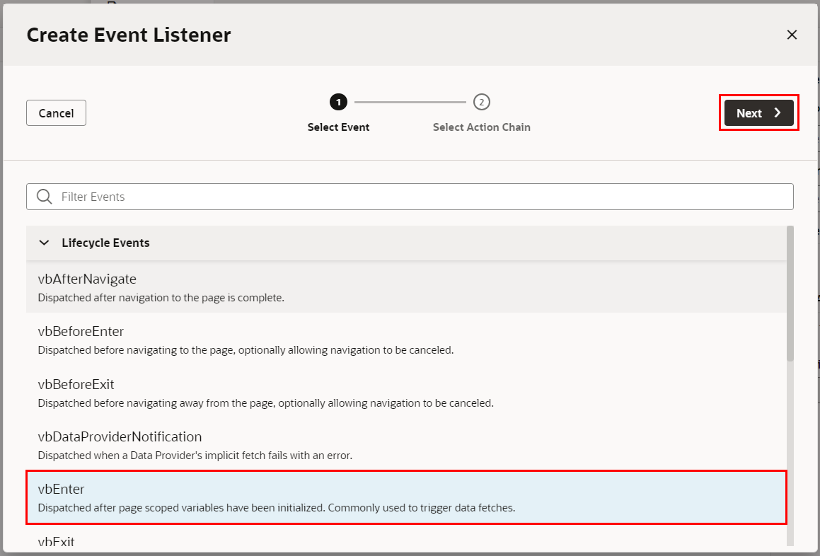 「vbEnter」を選択し、「Next >」ボタンをクリックします。 vbEnterイベントは、すべてのフロー変数またはページ変数が初期化されると、トリガーされます。詳細はこちらをご確認ください。