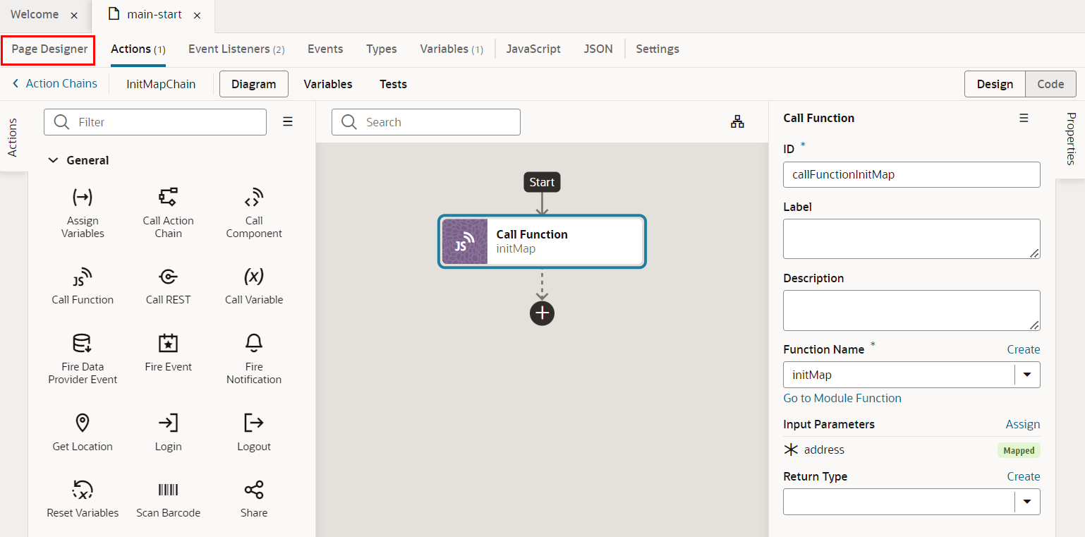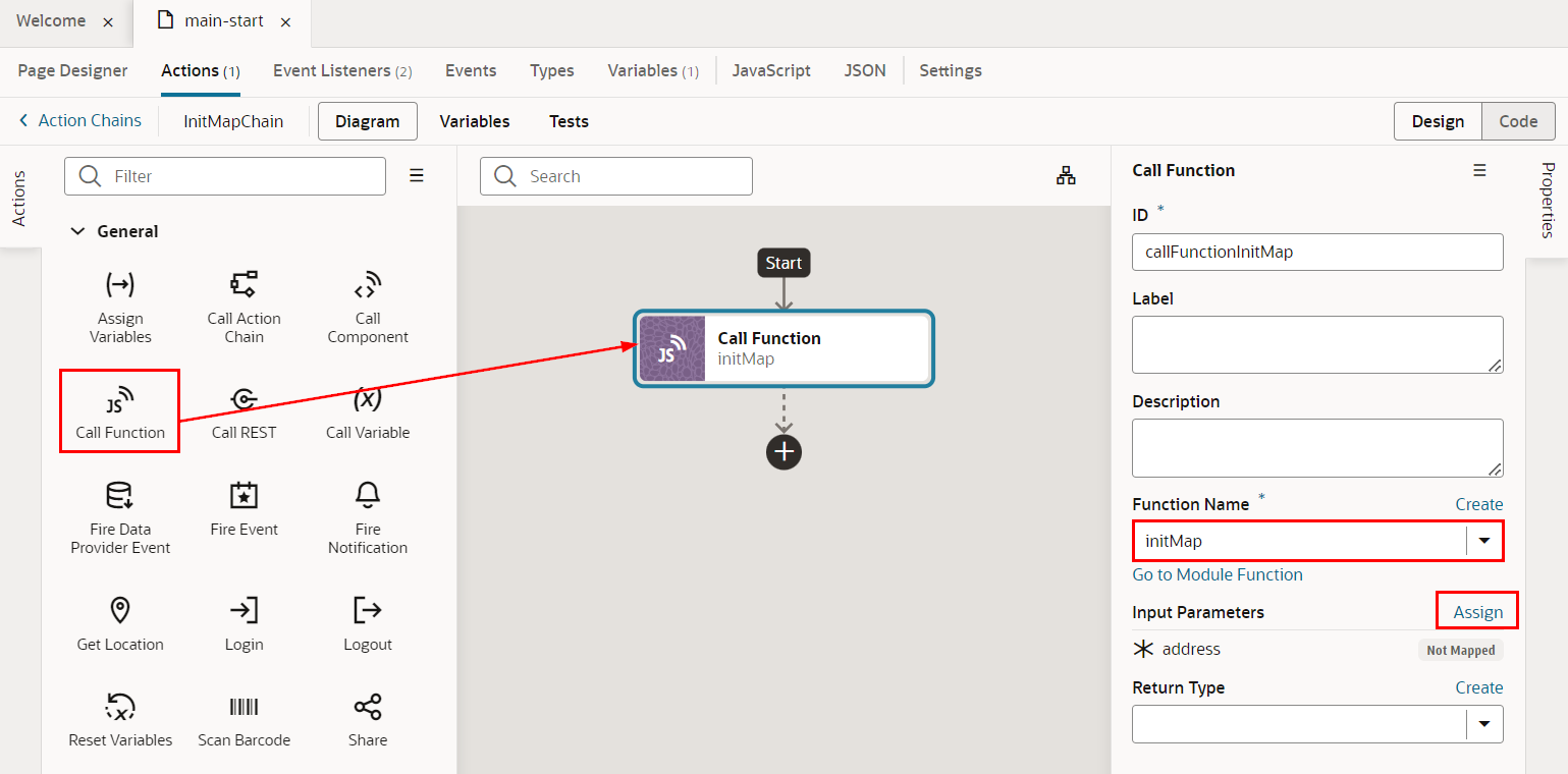 「Call Function」のアクションを「Start」 アクションの下に表示されている「+」マークの上にドラッグ&ドロップで設定し、右側に表示されたプロパティ・インスペクタで「Function Name」に「initMap」を選択します。(この「initMap」は前の手順で追加したJavascriptの関数名です。)