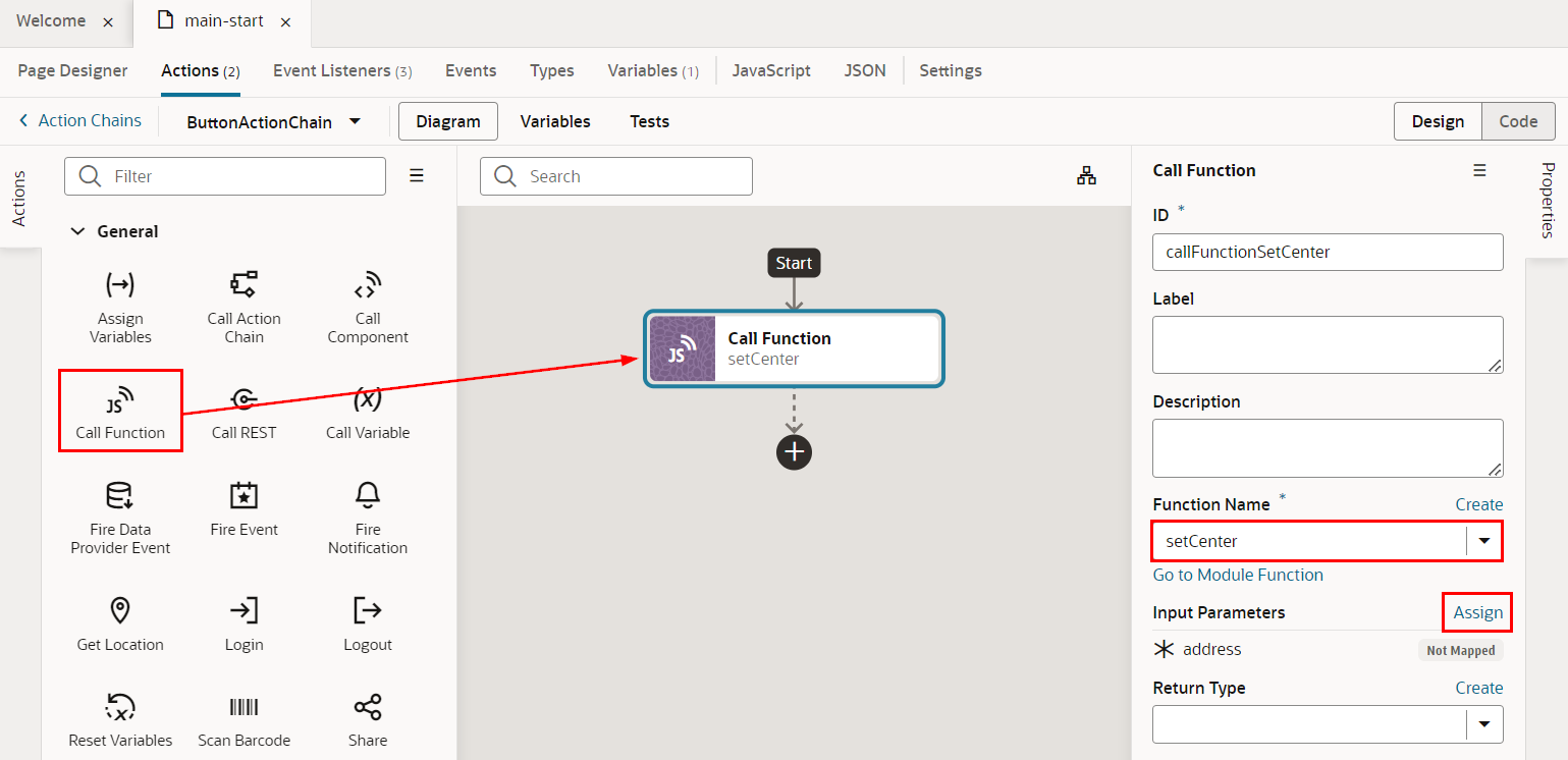 これにより、「検索」ボタンがクリックされた時に起動される、IdがButtonClickActionのアクション・チェーンが定義されます。画面の左側には、アクション・パレットが表示されています。「Call Function」のアクションを「Start」アクションの下に表示されている「+」マークの上にドラッグ&ドロップで設定し、右側に表示されたプロパティ・インスペクタで「Function Name」に「setCenter」を選択します。(この「setCenter」は前の手順で追加したJavascriptの関数名です。)