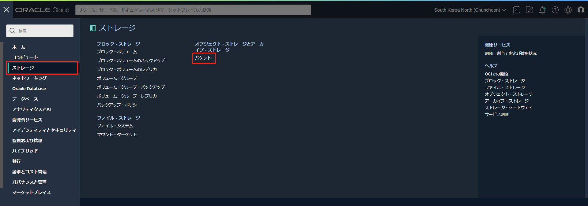 コンソールのメニューから「ストレージ」を選択して、「オブジェクト・ストレージとアーカイブ・ストレージ」の「バケット」へ進みます。