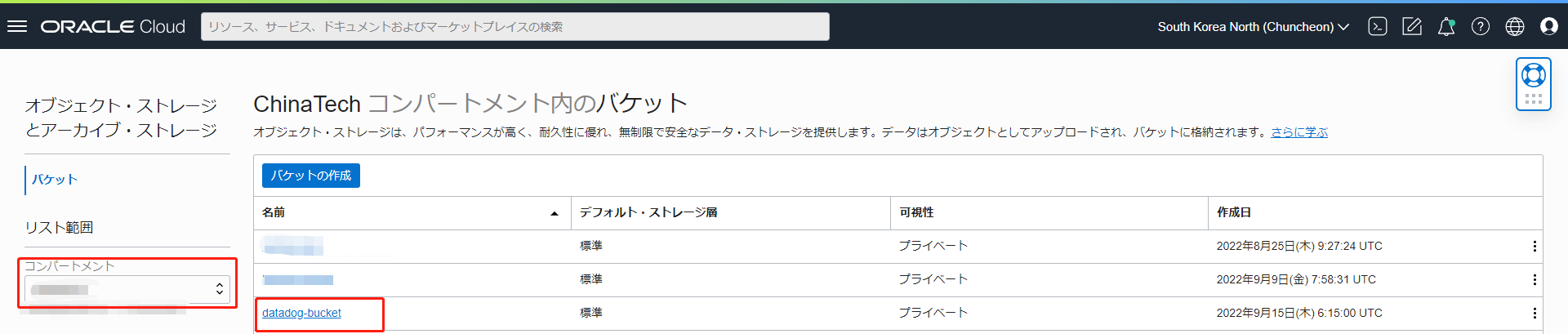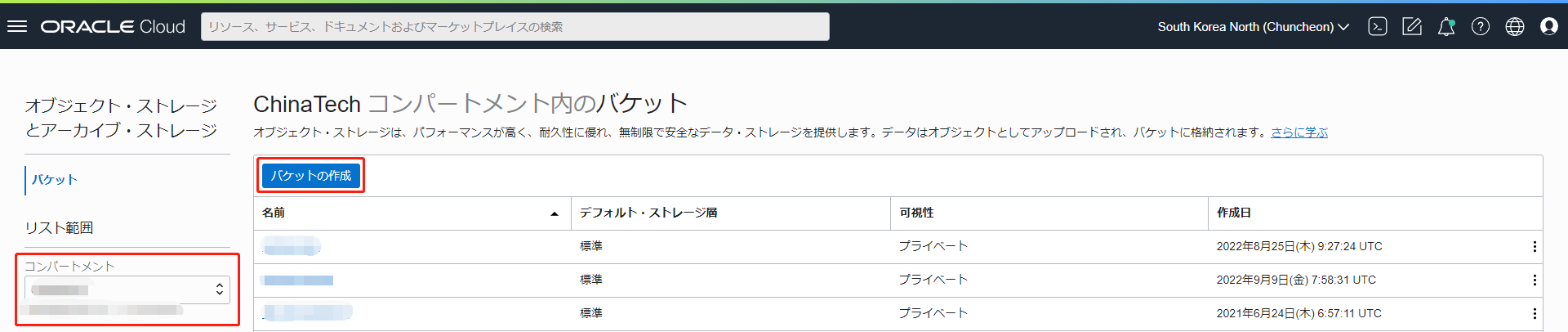 使用するコンパートメントを選択して、「バケットの作成」をクリックします。