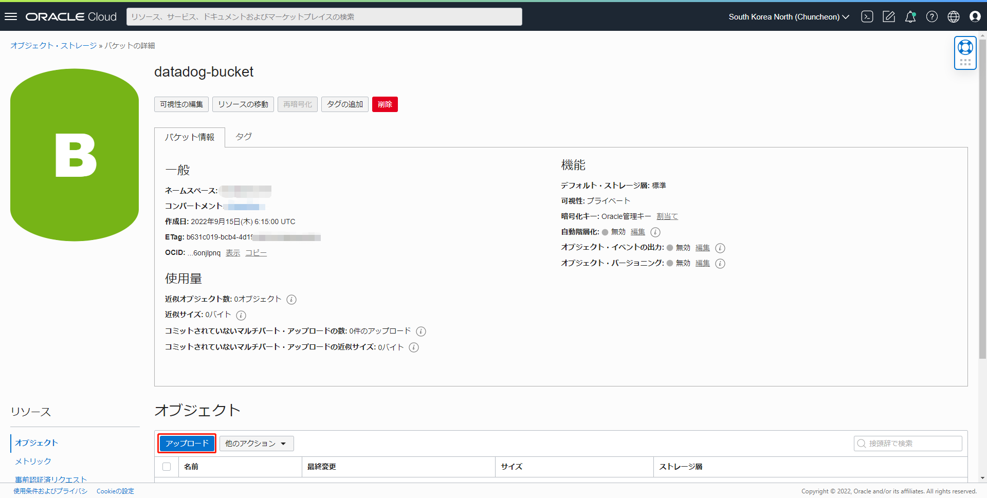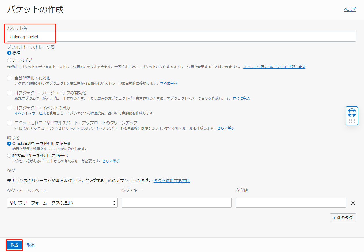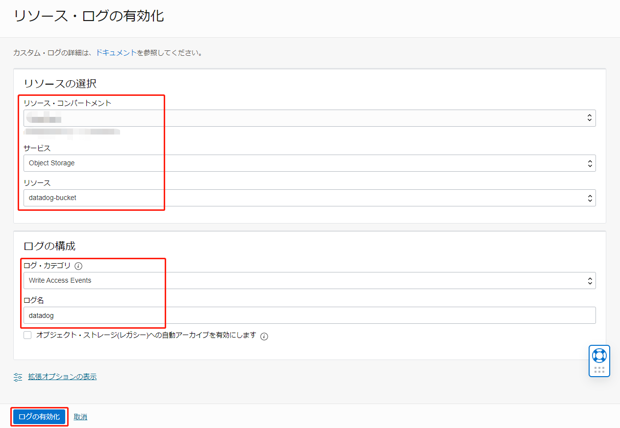 - リソース:datadog-bucket(バケット作成のステップで作成したバケットです)