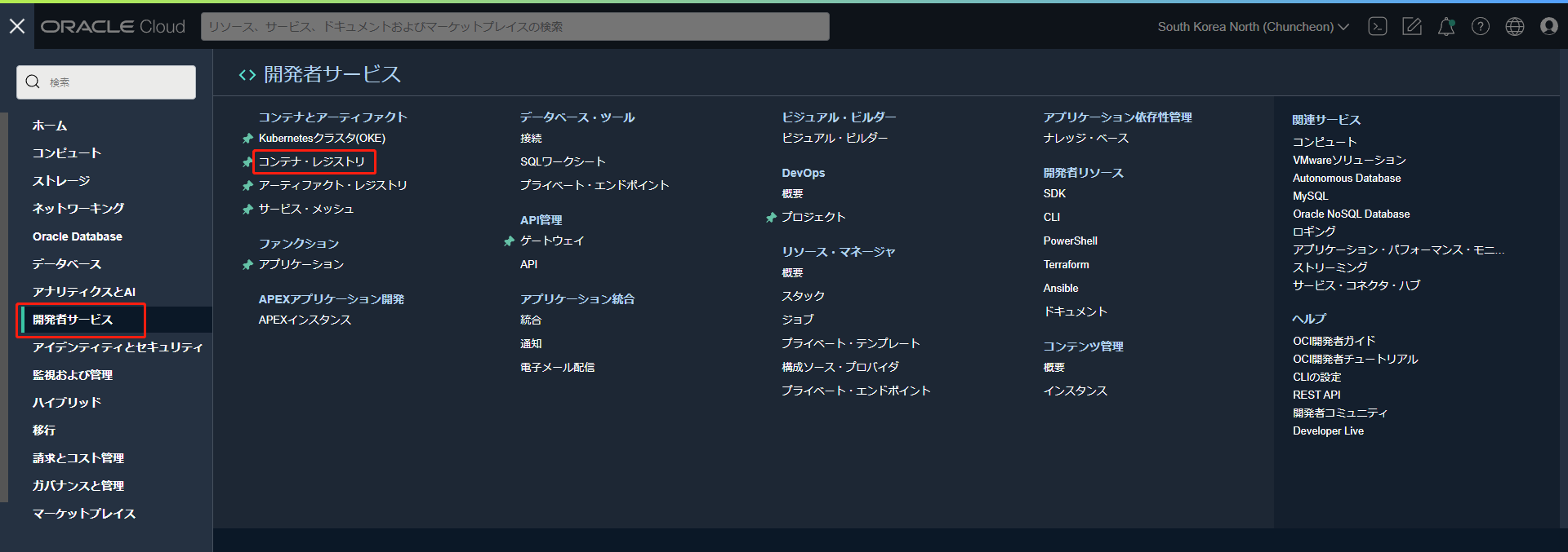 コンソールのメニューから「開発者サービス」を選択し、「コンテナ・レジストリ」へ進みます。