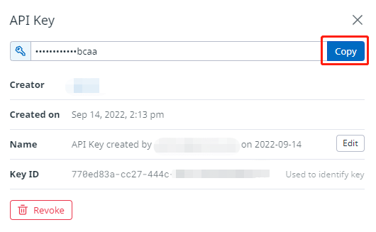 API Keyの画面で「Copy」をクリックして、コピーされたAPI Keyをメモしてください。