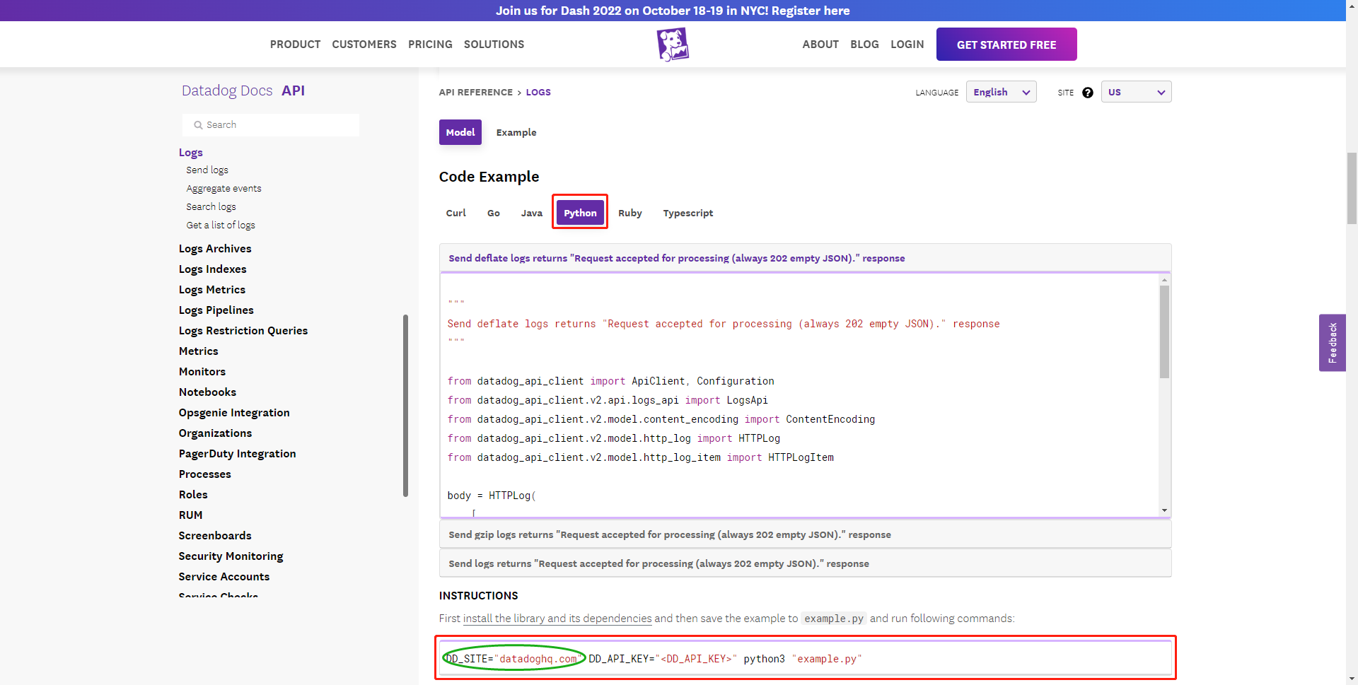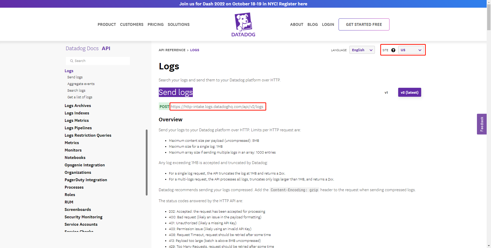 DataDog API Reference-Logsに移動して、「SITE」の項目で、DataDog IDの登録で選択したリージョンを選択します。この例では「US」を選択します。