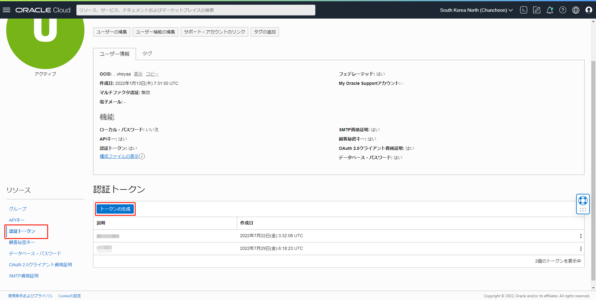 ユーザー情報の詳細ページで「認証トークン」を選択して「トークンの生成」へ進みます。