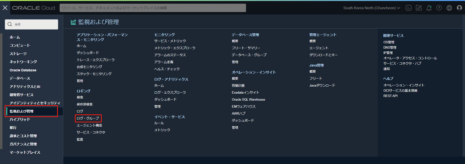 コンソールのメニューから、「監視および管理」を選択して「ロギング」の「ログ・グループ」へ進みます。
