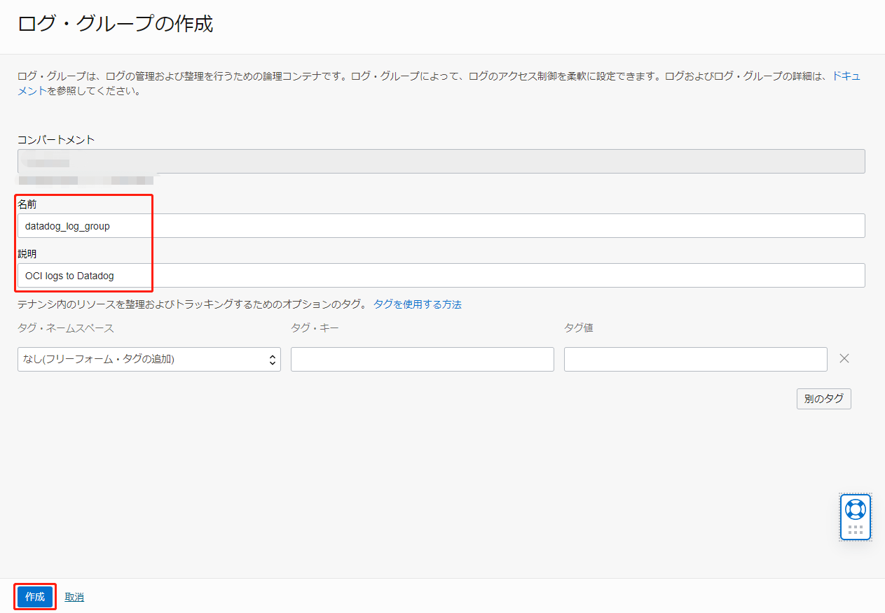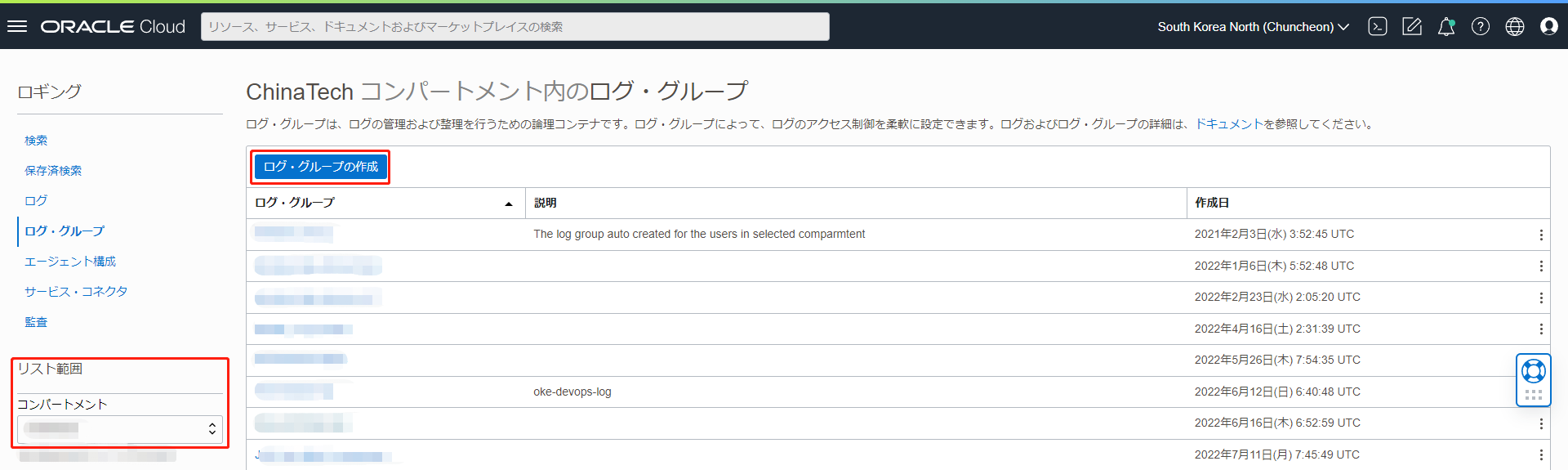 使用するコンパートメントを選択して、「ログ・グループの作成」をクリックします。