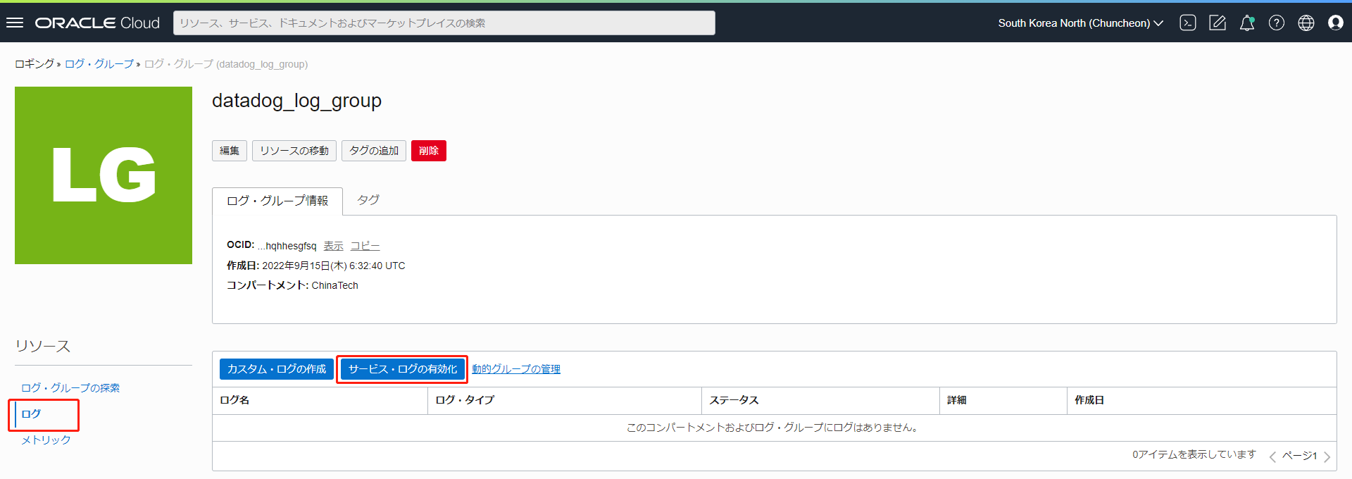 ログ・グループの詳細ページで、「リソース」の「ログ」を選択して、「サービス・ログの有効化」をクリックします。