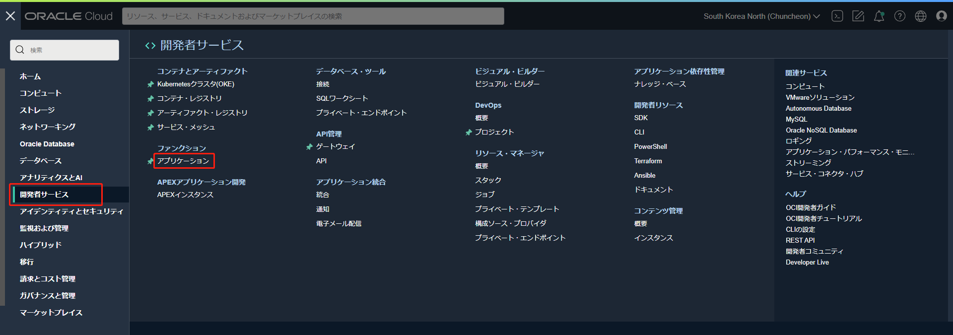 コンソールのメニューから「開発者サービス」を選択し、「ファンクション」の「アプリケーション」へ進みます。