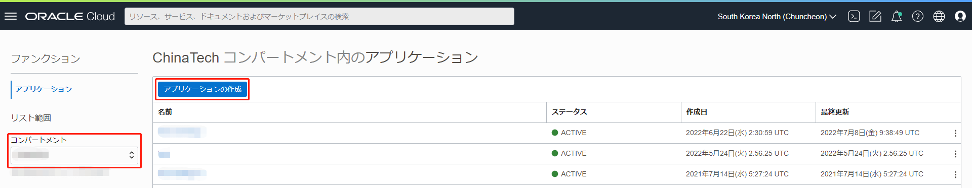 使用するコンパートメントを選択し、「アプリケーションの作成」をクリックします。