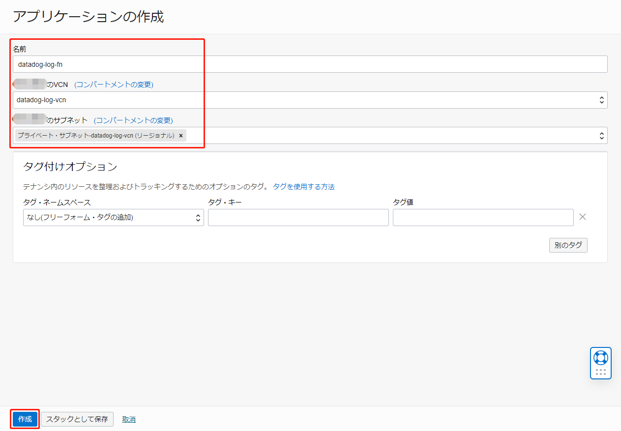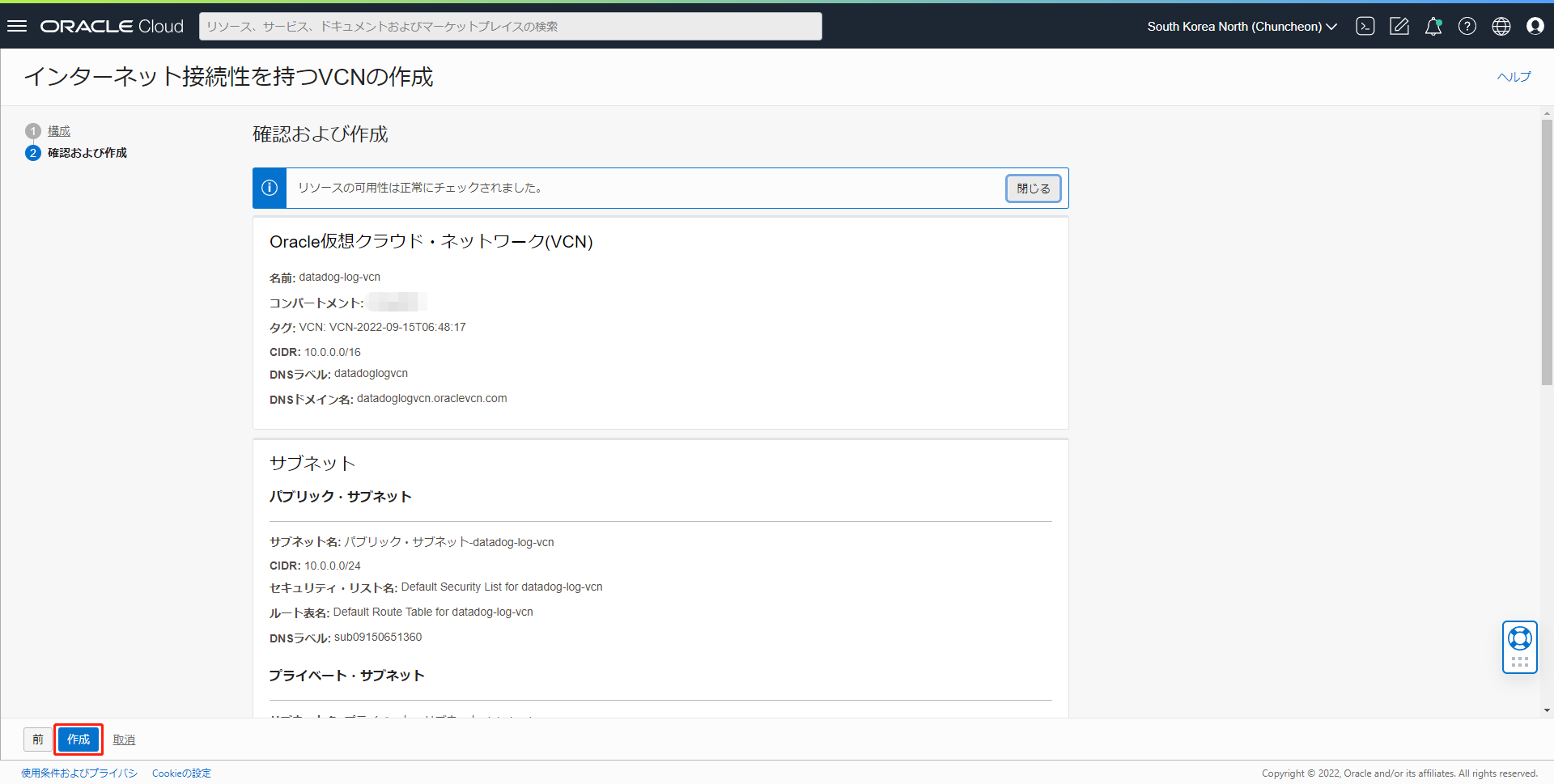 - VCN:datadog-log-vcn(VCNの作成のステップで作成したVCNです)