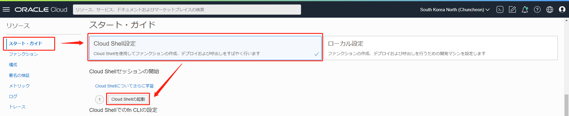 今回は、Cloud Shellを利用するので、「Cloud Shell設定」を選択して「Cloud Shellの起動」をクリックします。(ローカル環境を使用する場合は「ローカル設定」を選択し、内容に従って進めてください)