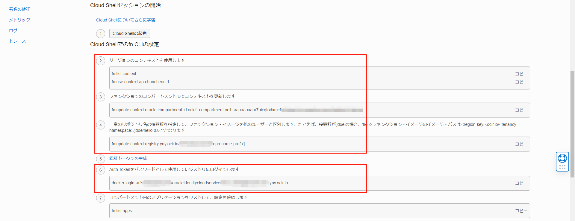 Cloud Shellで、2番、3番、4番、6番のコマンドをコピーして実行します。(利用するリージョンとテナントによって、内容は異なります)
