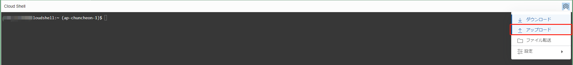 Cloud Shellで、画面右上の「Cloud Shellのメニュー」にある「アップロード」をクリックします。