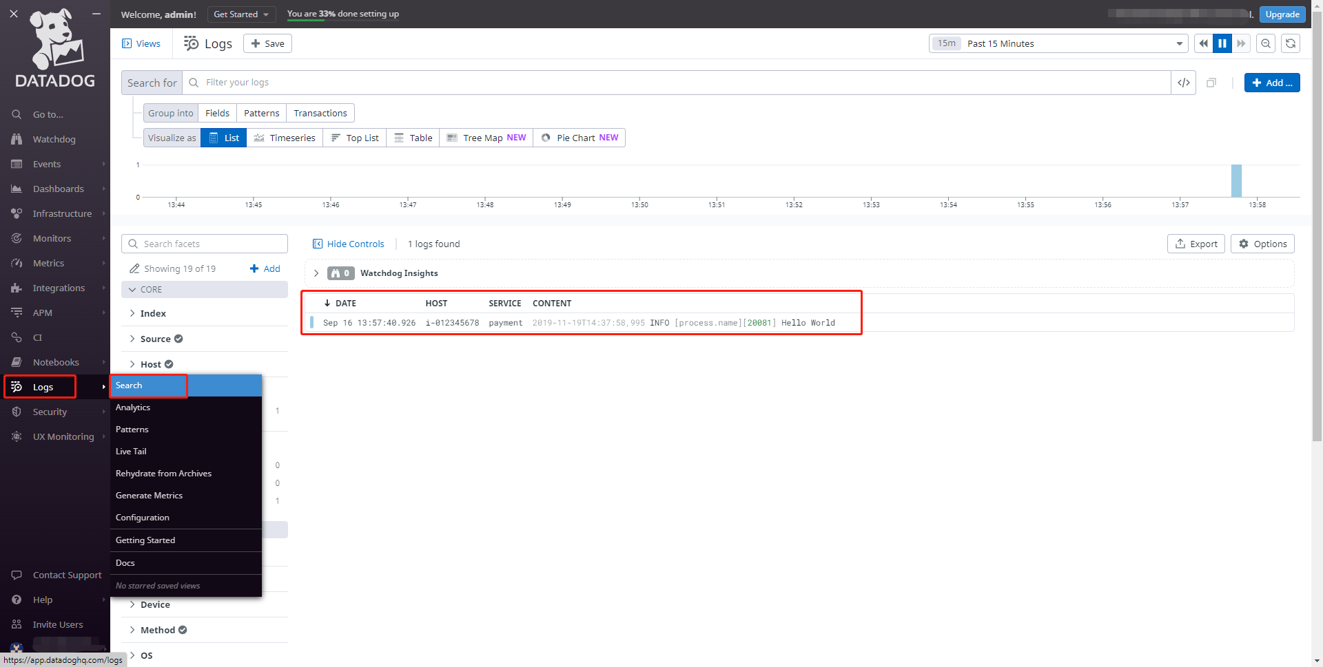 DataDogのコンソールで、「Logs」へ進み「Search」をクリックします。