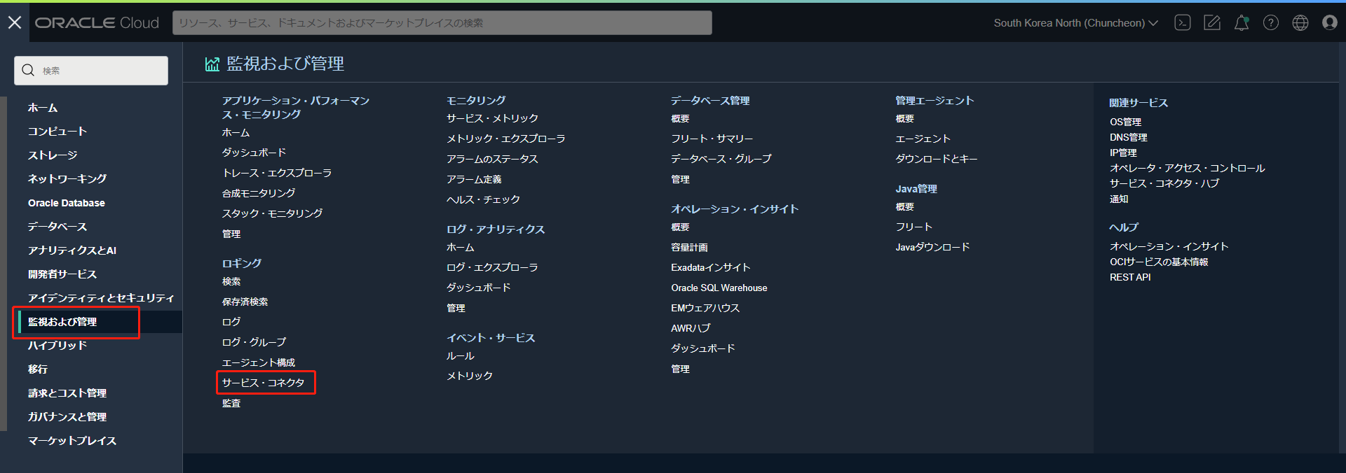 コンソールのメニューから、「監視および管理」を選択して「サービス・コネクタ」へ進みます。