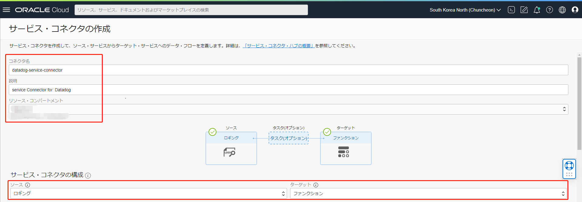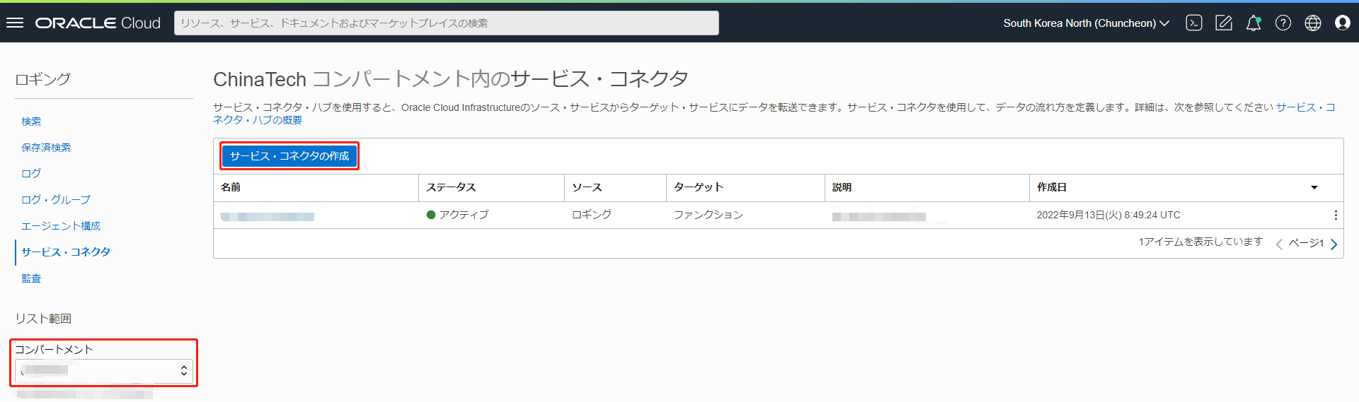 使用するコンパートメントを選択して、「サービス・コネクタの作成」をクリックします。