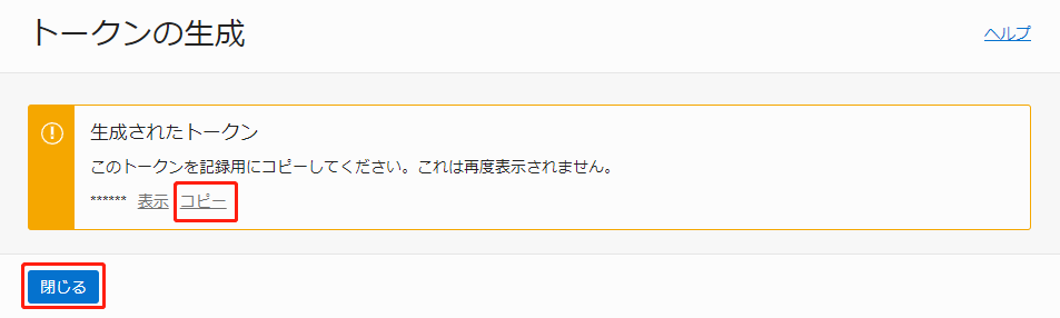 「コピー」をクリックして、生成されたトークンをメモしてください。これは再度表示されませんのでご注意ください。メモしたら「閉じる」をクリックします。