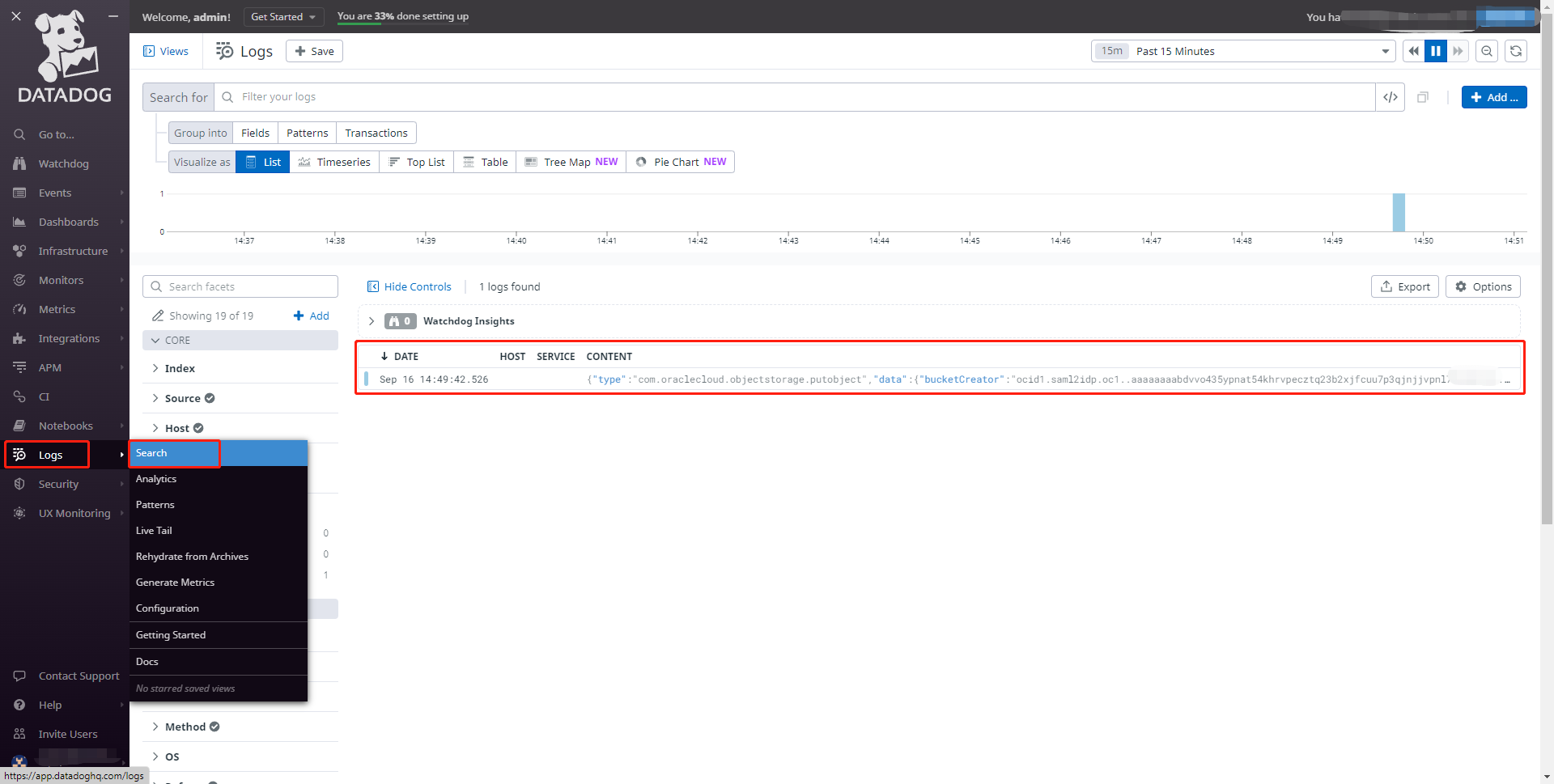 バケットにファイルをアップロードするイベント・ログが、サービス・コネクタとファンクションを経由して、DataDogにアップロードされたことを確認できます。