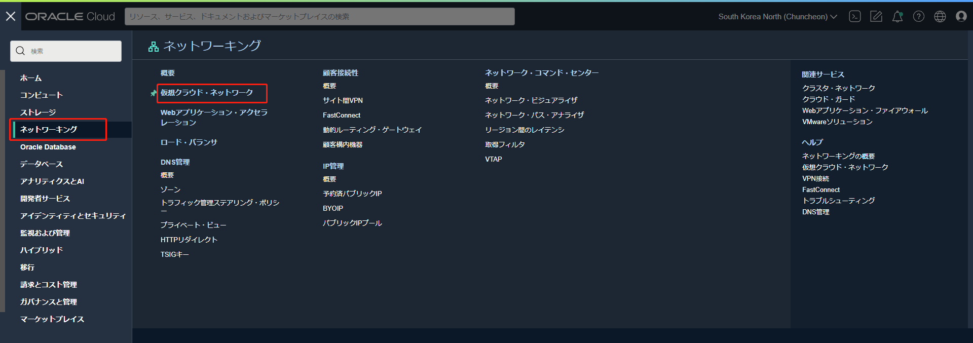コンソールのメニューから「ネットワーキング」を選択し、「仮想クラウド・ネットワーク」へ進みます。