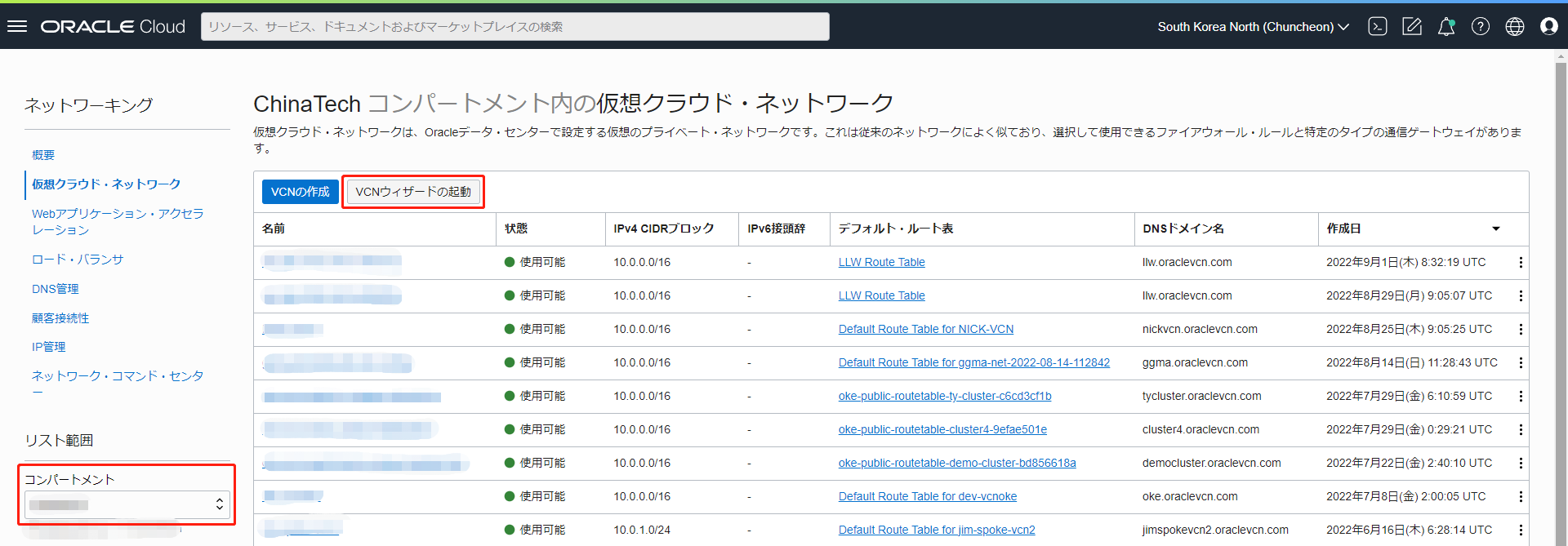 使用するコンパートメントを選択して、「VCNウィザードの起動」をクリックします。