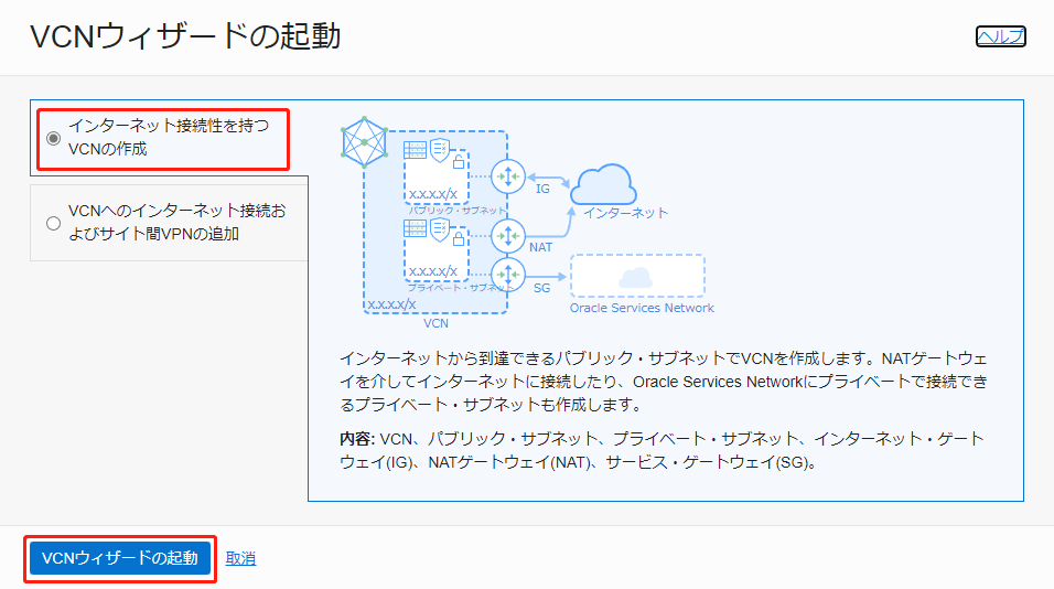 「インターネット接続性を持つVCNの作成」を選択して、「VCNウィザードの起動」をクリックします。